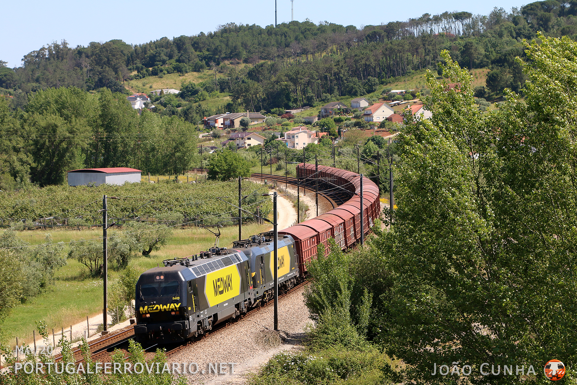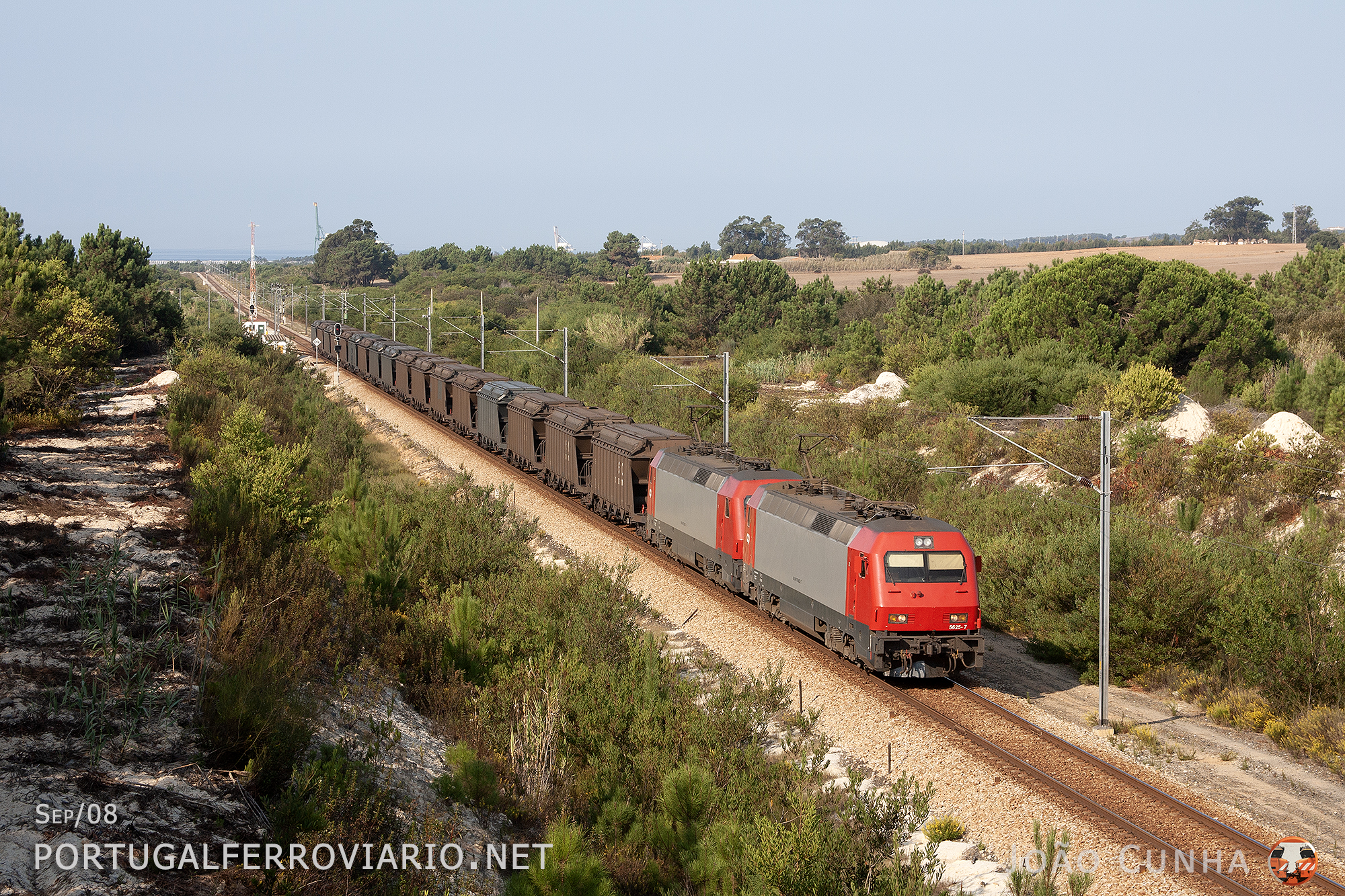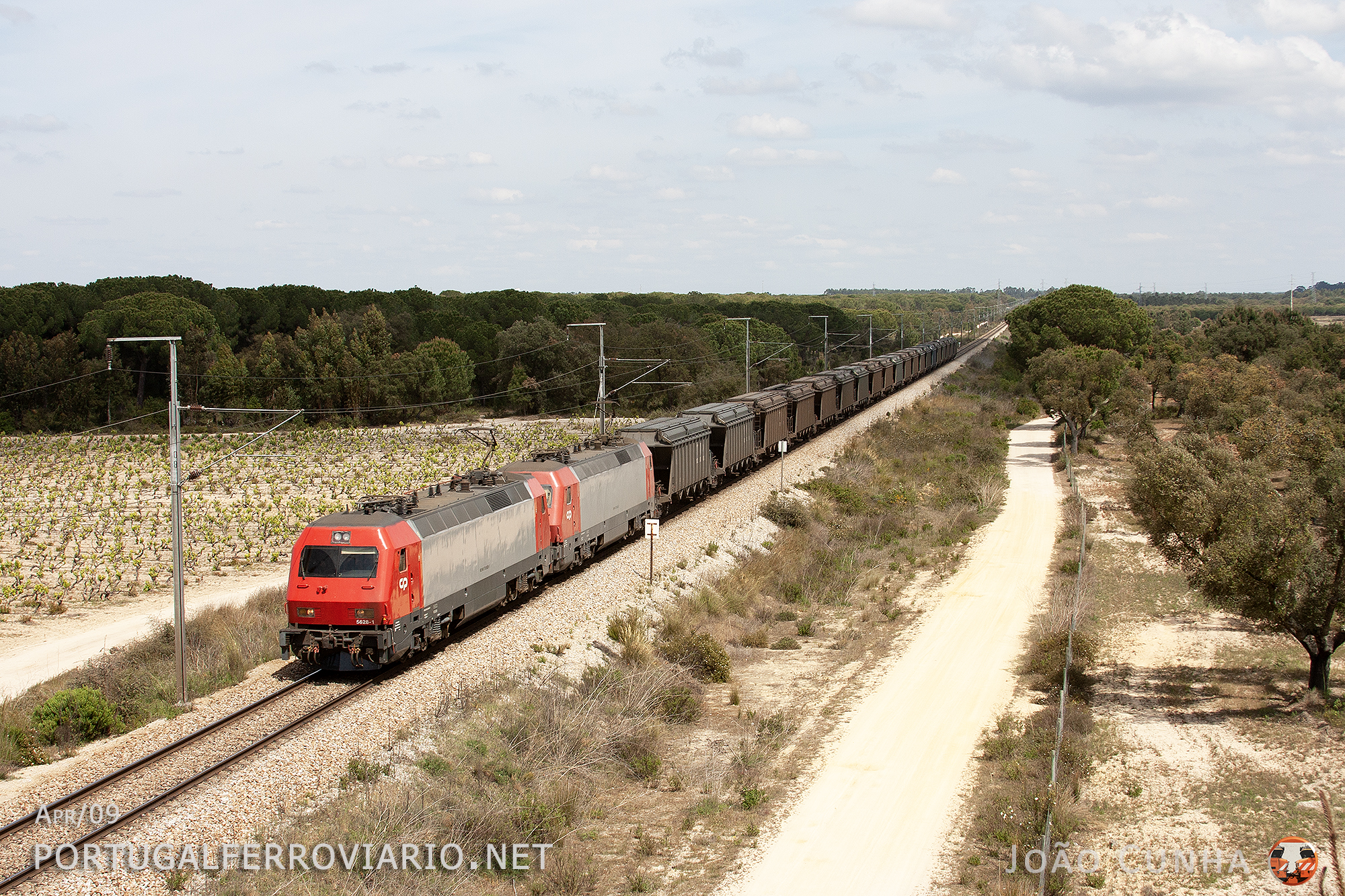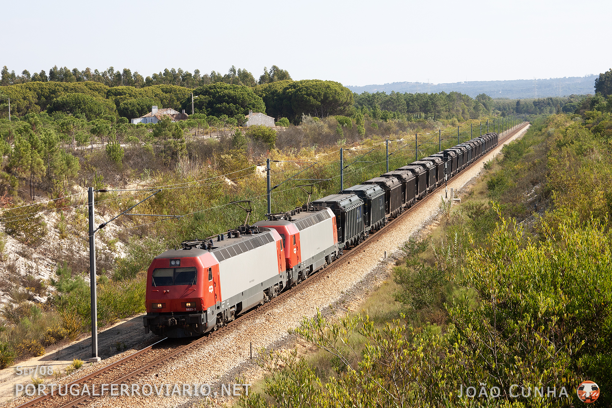 Climbing the easy gradient just south of Águas de Moura, 5628+5623 easily haul this empty coal train to Sines