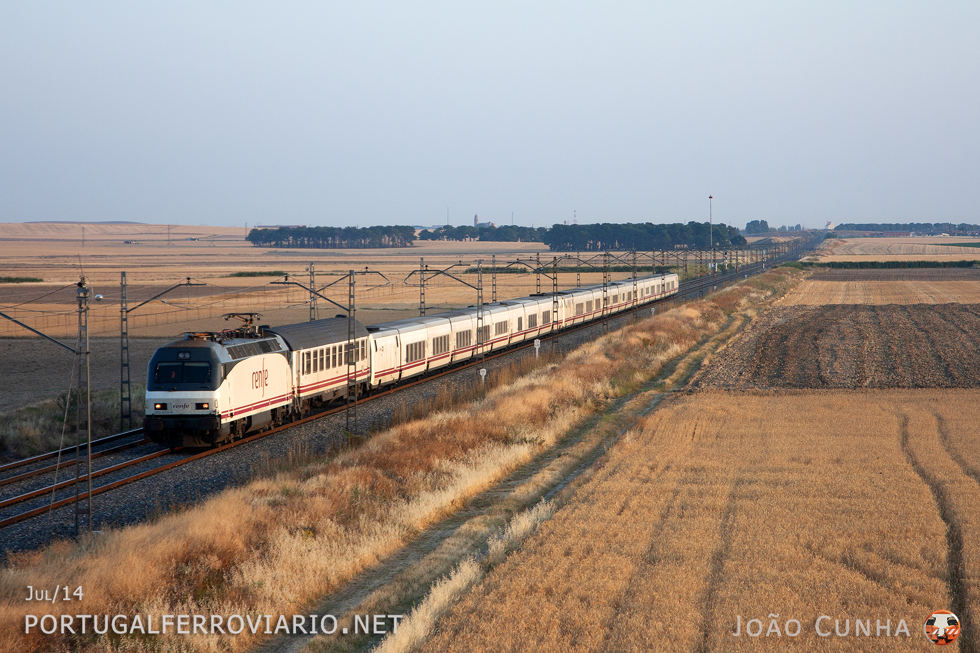 252.033 leading the Lusitania Lisboa - Madrid trenhotel with an extra conventional coach and the Ferrol - Madrid trenhotel, near Palacios de Goda